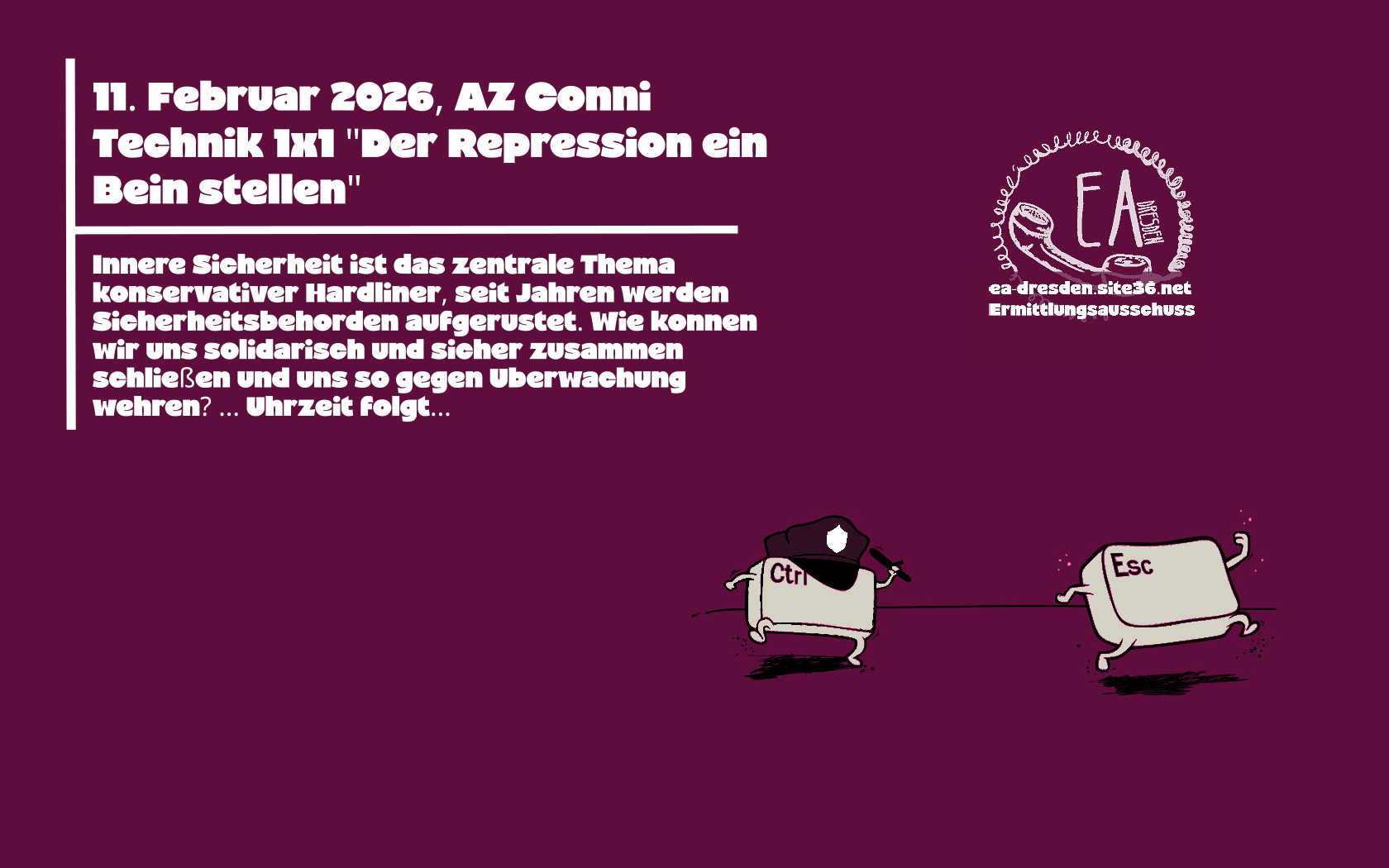 Am 11. Februar 2026 sind wir mit dem Technik 1×1 bei der Küche für Alle im AZ Conni zu Gast. Auch hier starten wir 19 Uhr. Im Technik-1×1 reden wir darüber, wie uns Technik helfen kann uns zu organisieren. Gleichzeitig geht auch viel Risiko mit ihr einher. Also reden wir auch sehr ausführlich darüber, was Technik euch alles kaputt machen kann, da die Bullen sie fleißig für Ermittlungen nutzen.