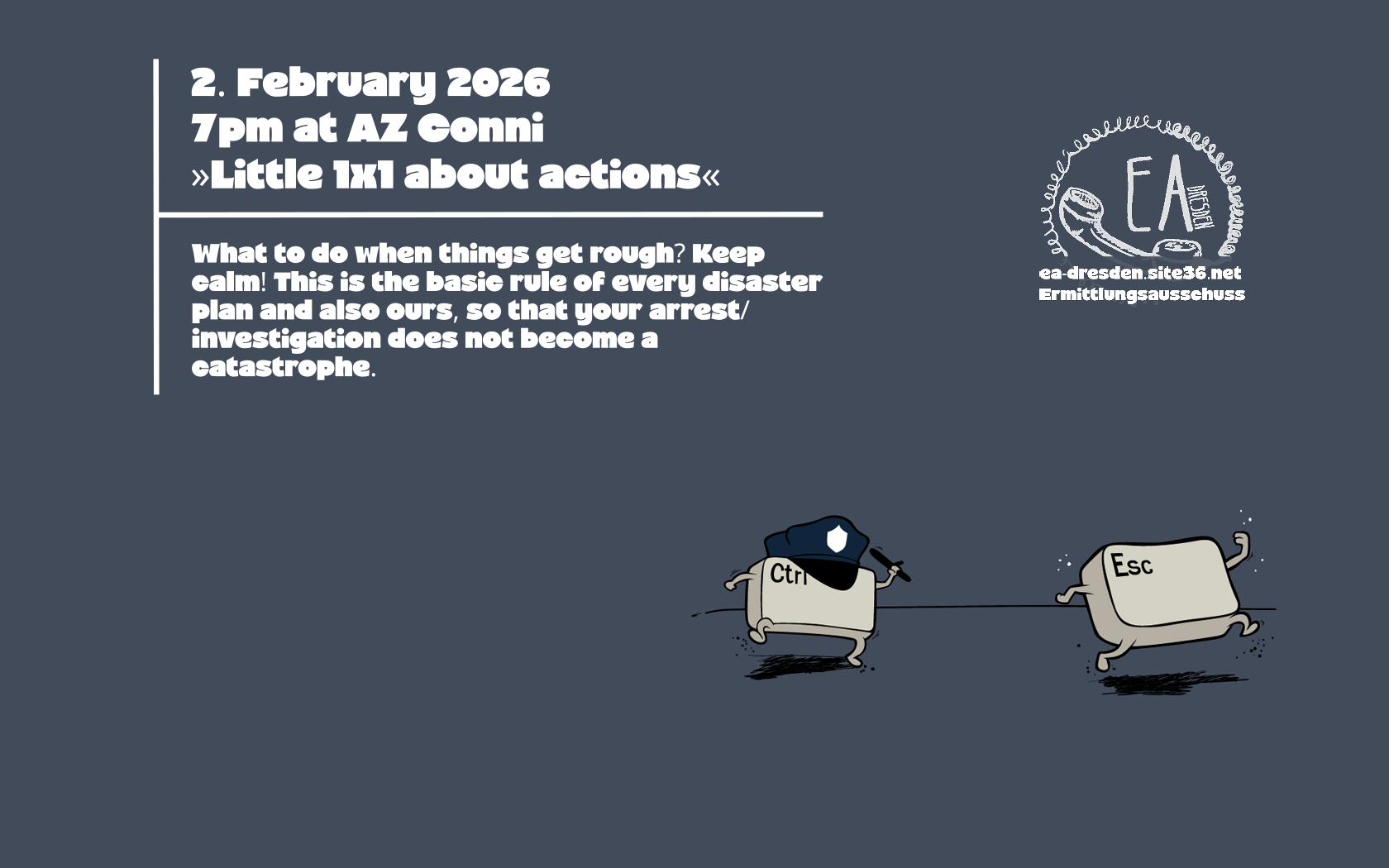 Am 2. Februar 2026 findet ihr uns um 19 Uhr im AZ Conni für das Aktions 1×1. Dort geht es vor allem um rechtliches rund um Demonstrationen und Aktionen. Was nehmt ihr mit? Was bleibt zu Hause? Was tun wenns brennt?